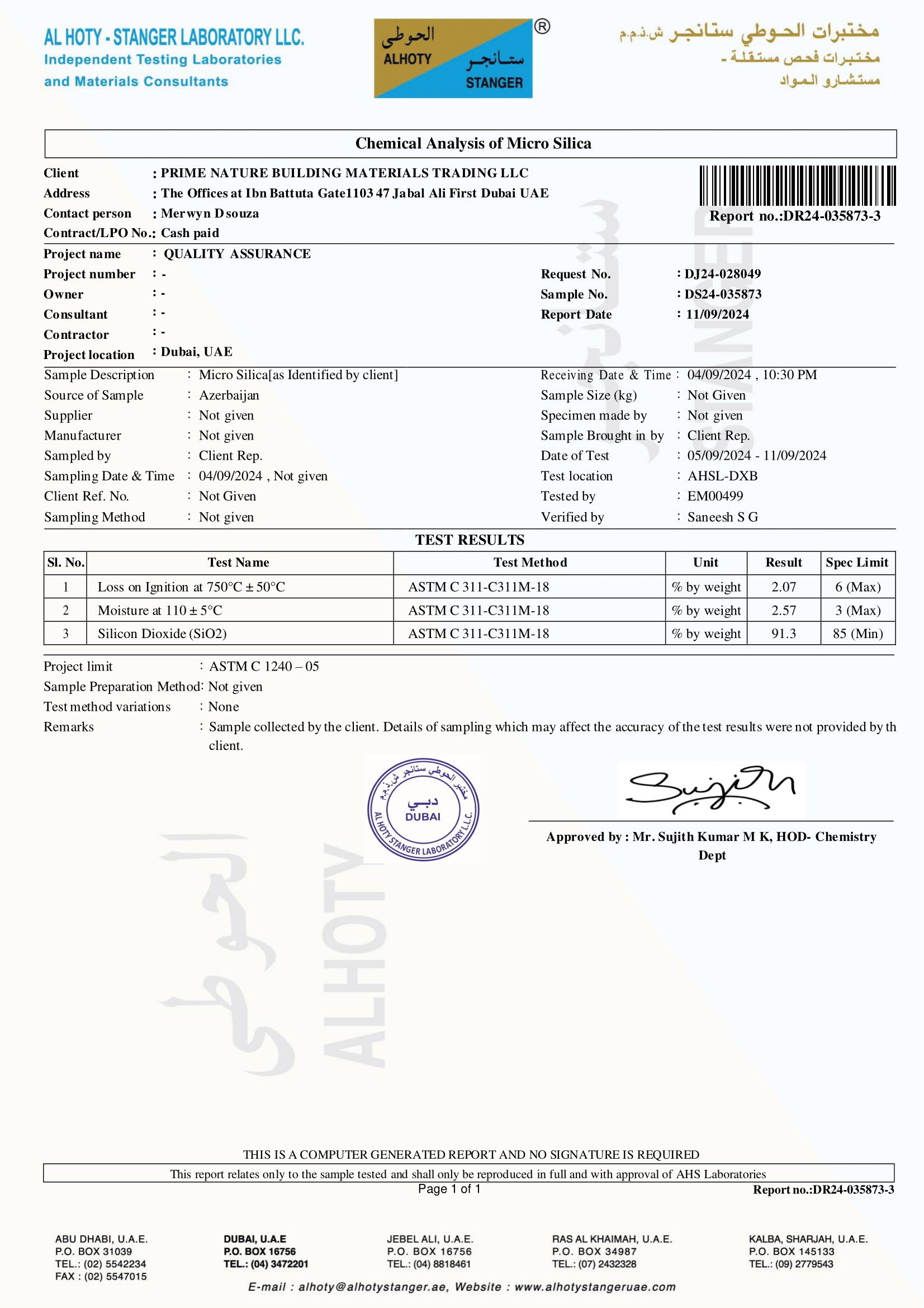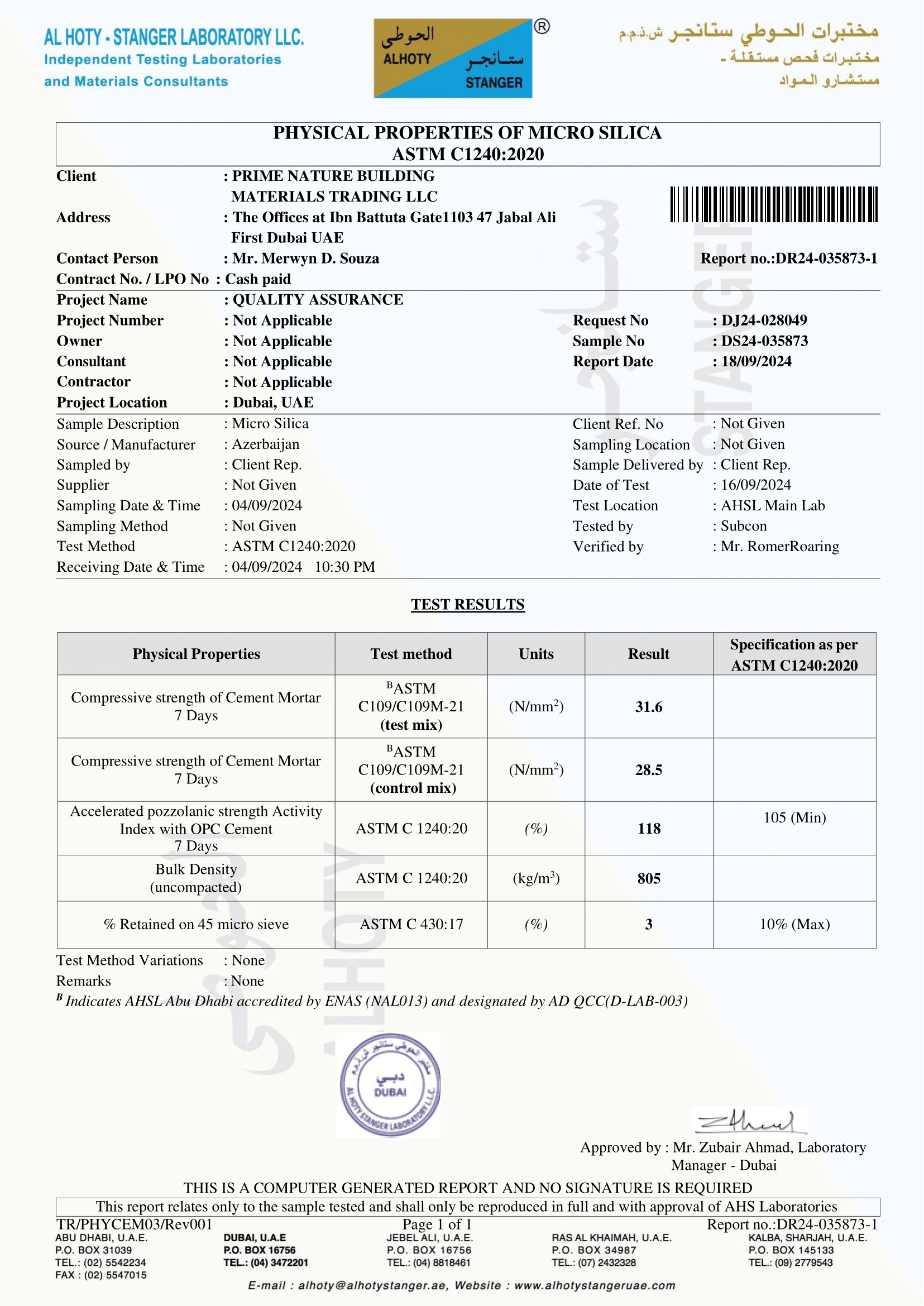 • Accelerated Pozzolanic Strength activity index @7 days ASTM C: 1240: 20 % - -